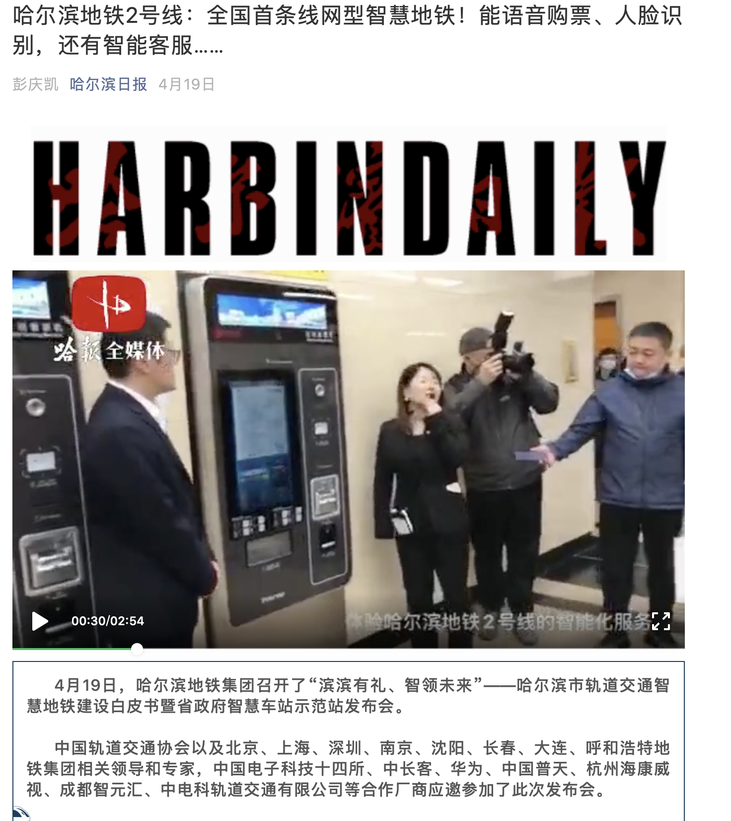 4月19日,哈尔滨地铁集团召开了“滨滨有礼、智领未来”——哈尔滨市轨道交通智慧地铁建设白皮书暨省政府智慧车站示范站发布会。